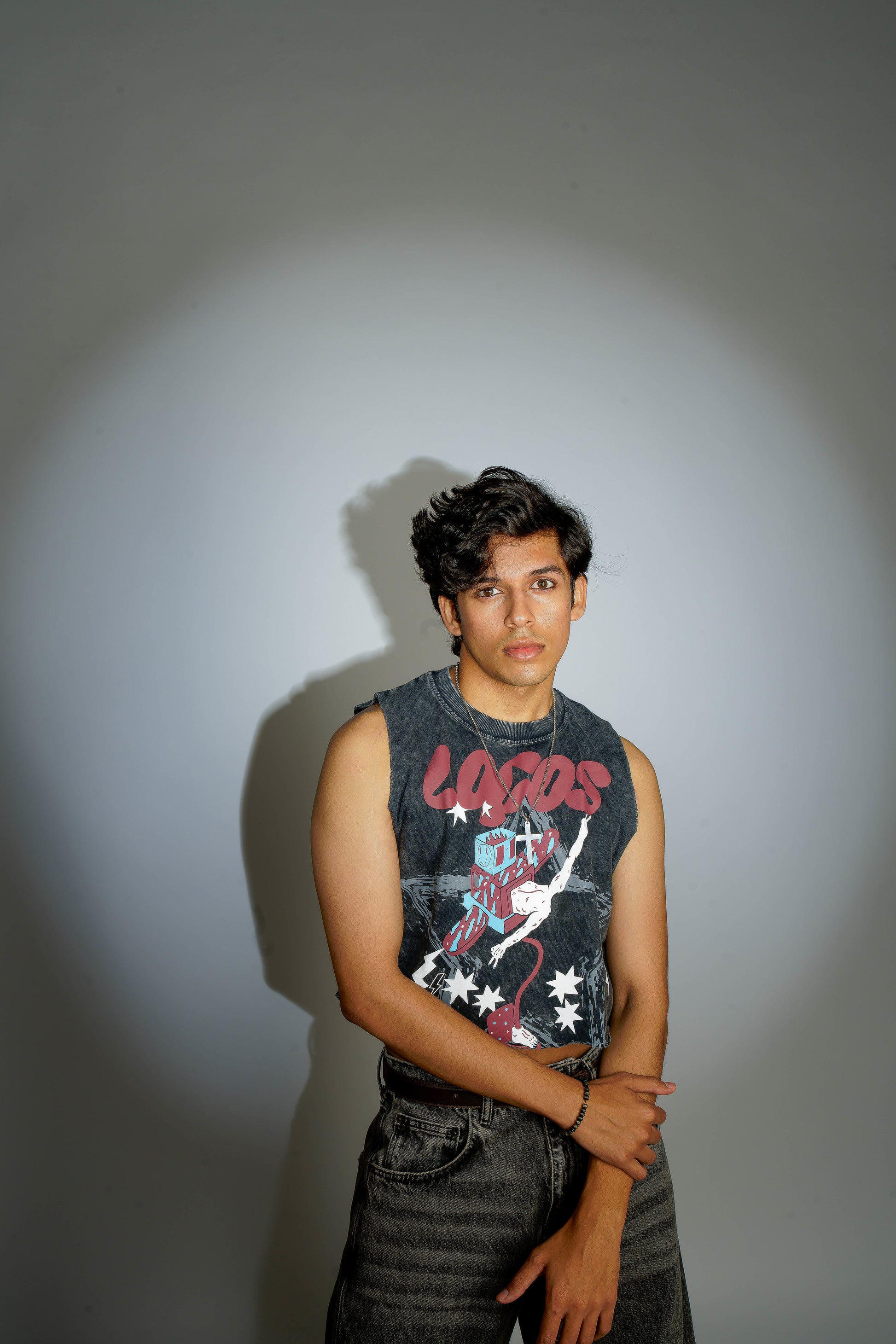 Relaxed fit sleeveless T-shirt made of spun cotton fabric. Featuring a round neck and contrast faded effect print on the front.