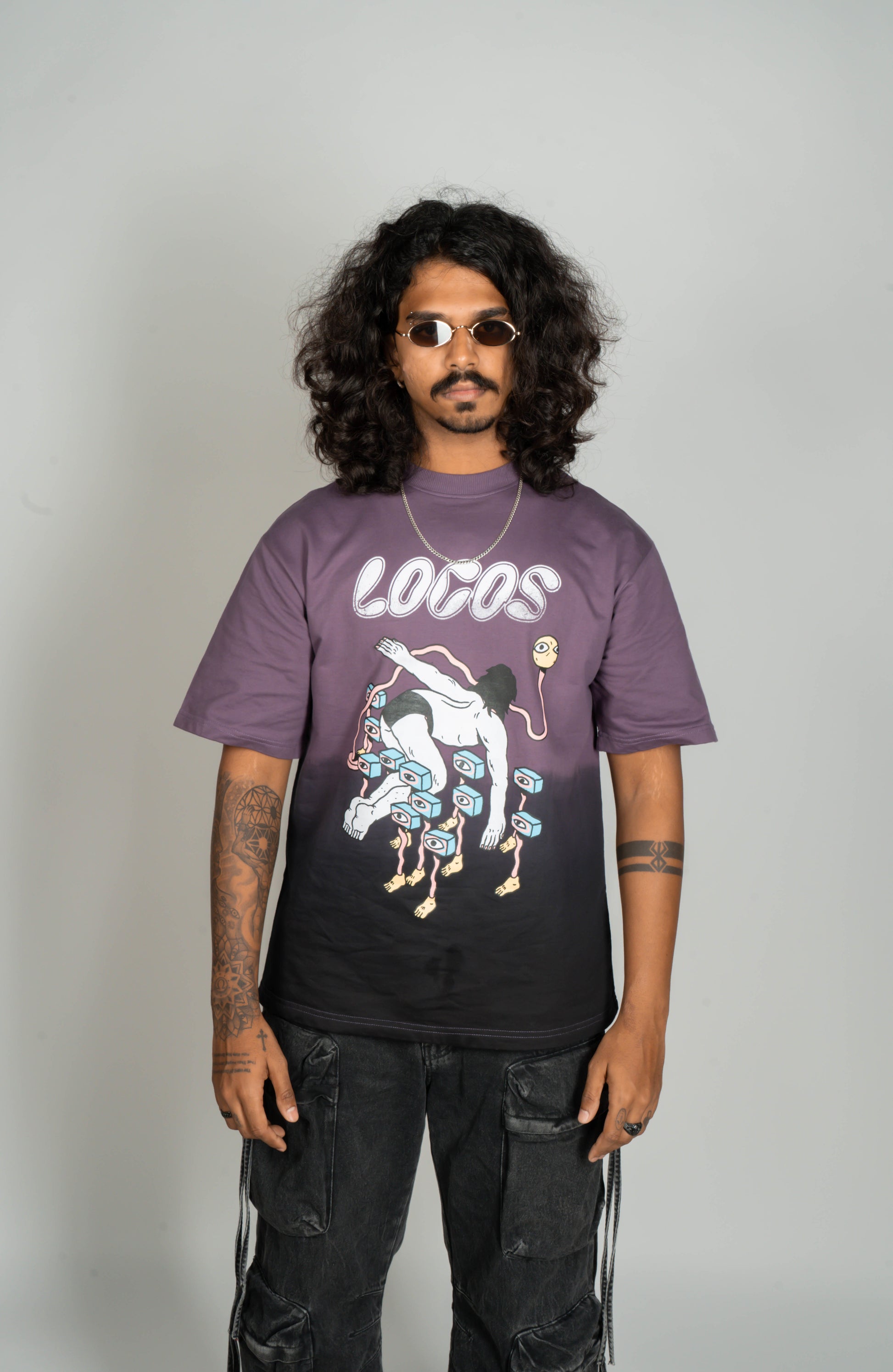 Relaxed fit dip-dyed with round neck and short sleeves. Contrast prints on front and back.