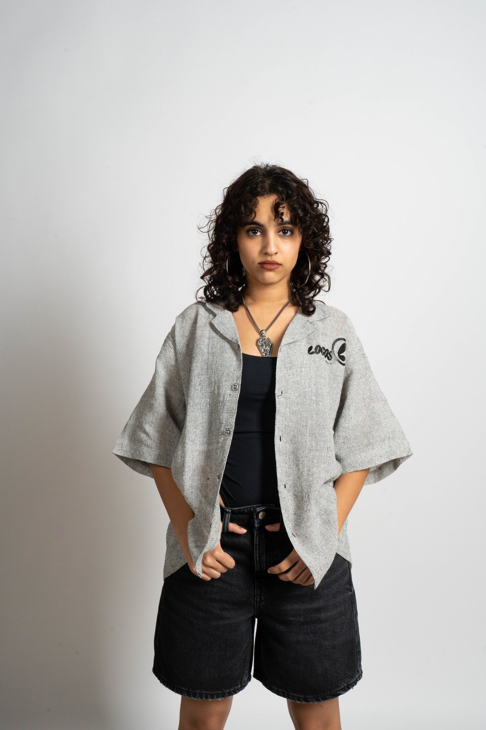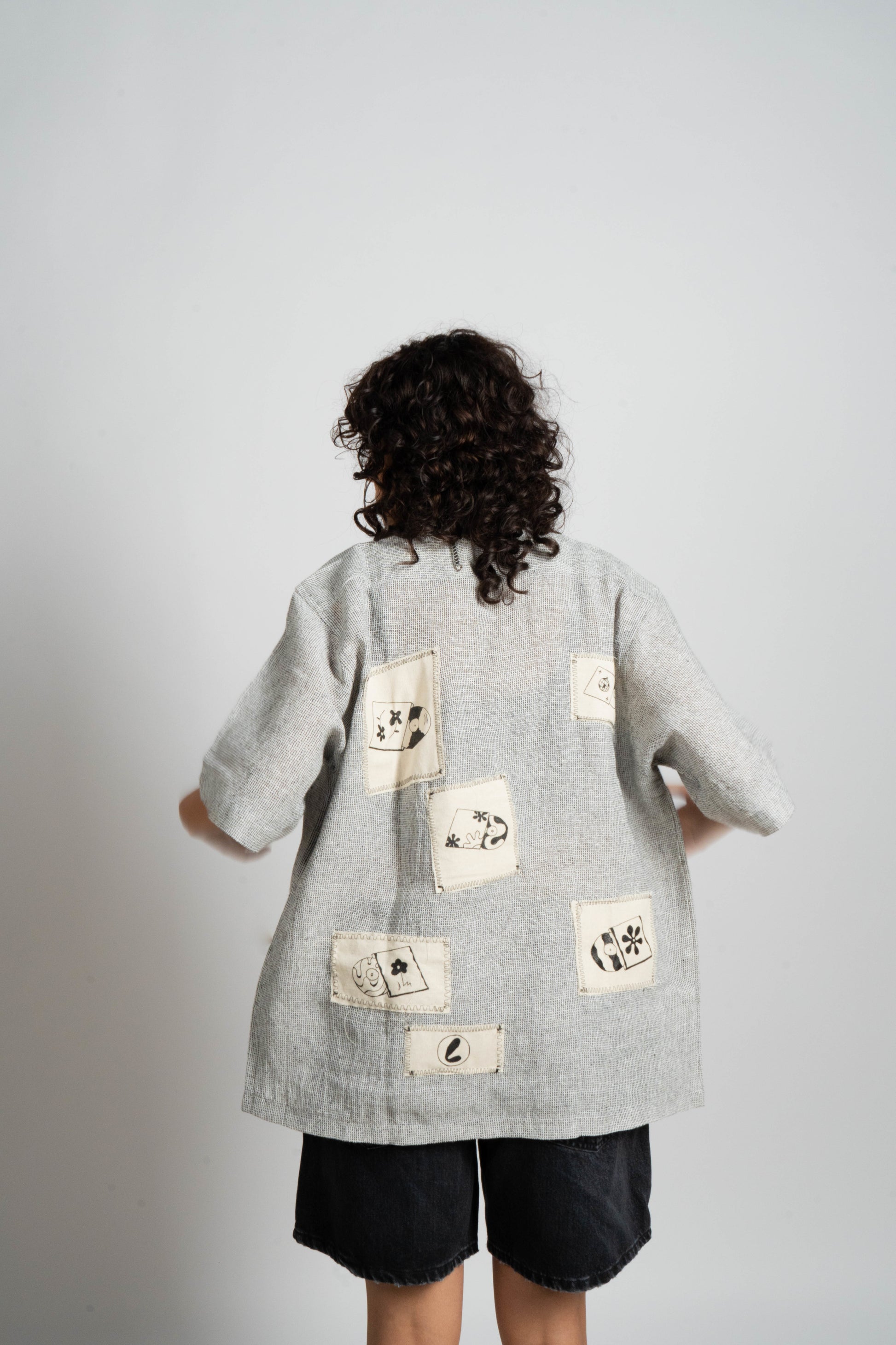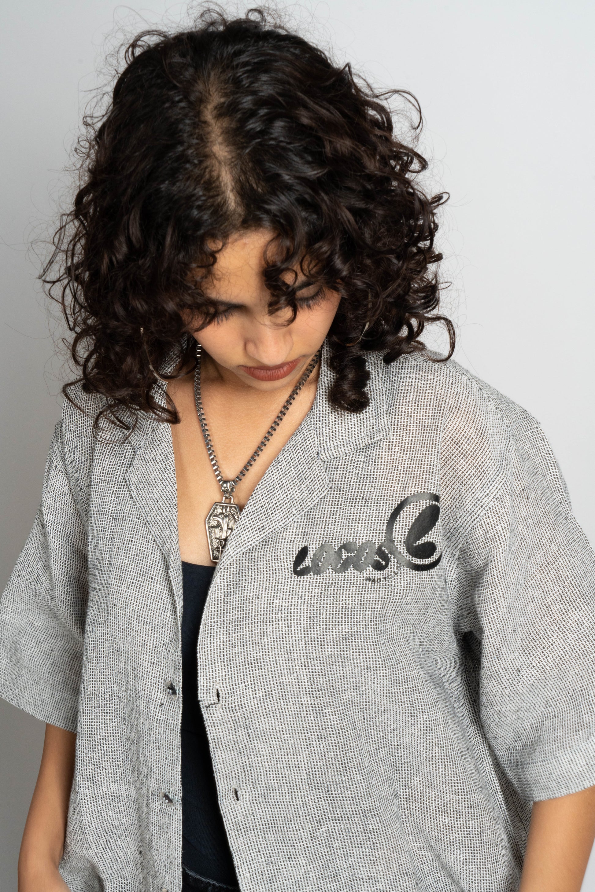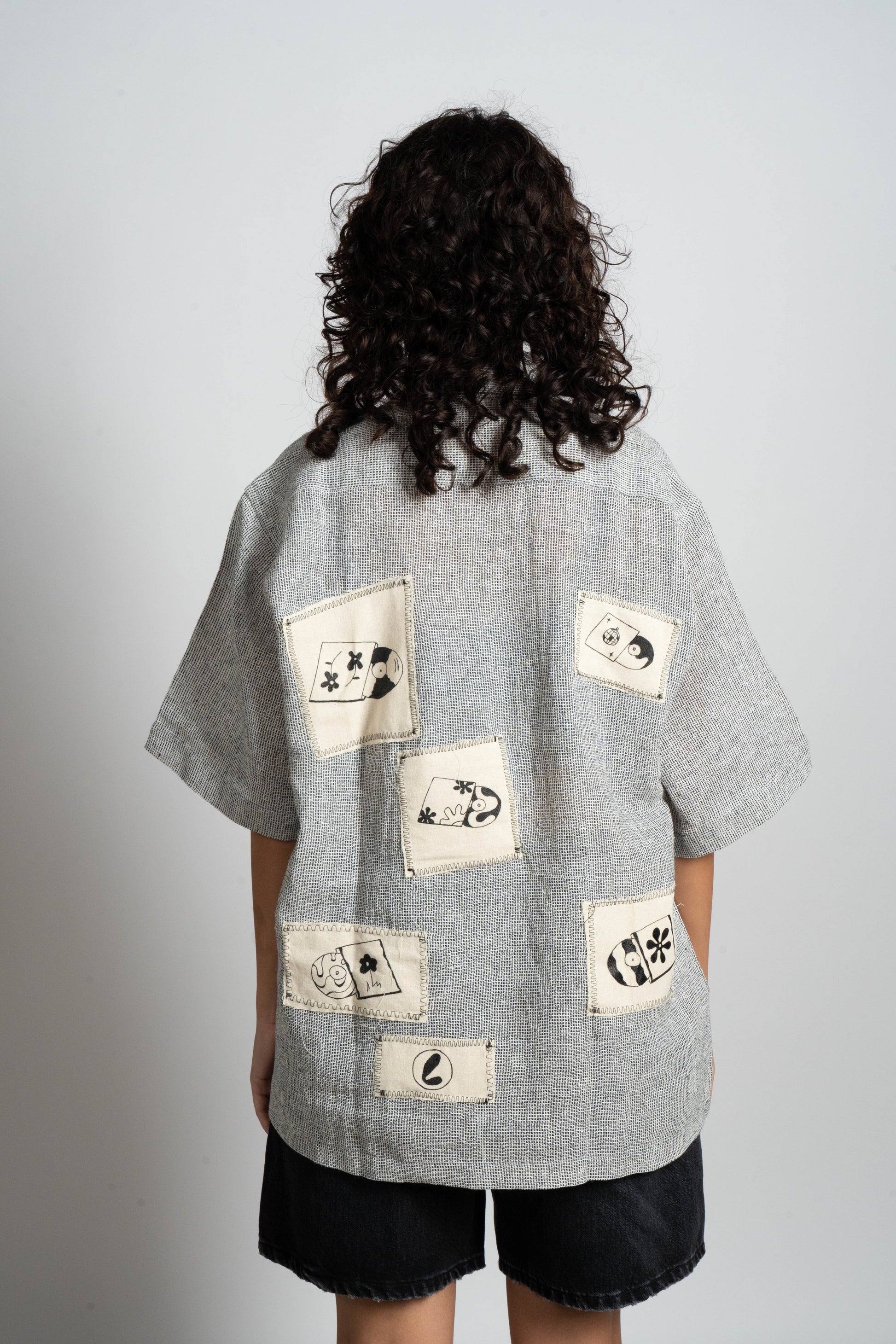 Relaxed fit shirt made of open textured fabric. Camp collar and short sleeves. Button up front. Muslin hand painted fabric at the back. Contrast print logo on the front.