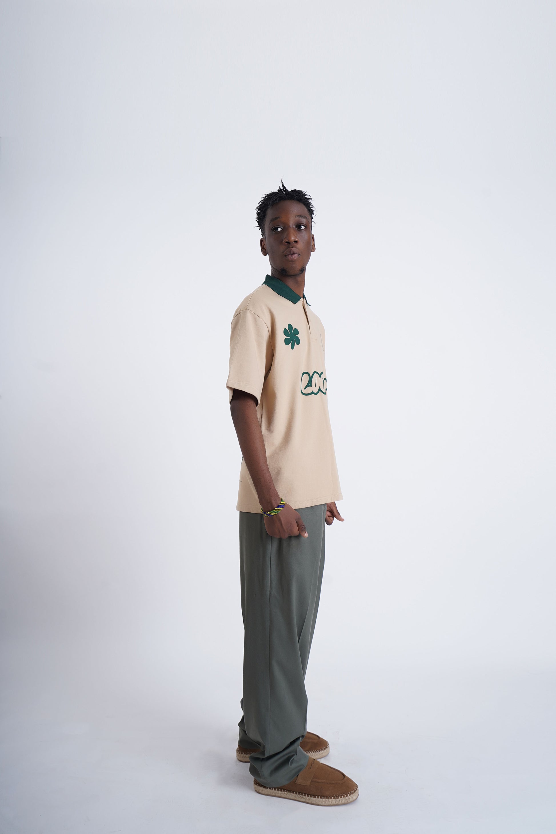 Collared polo shirt with front fastening. Short sleeves. Contrast prints on the front and back
